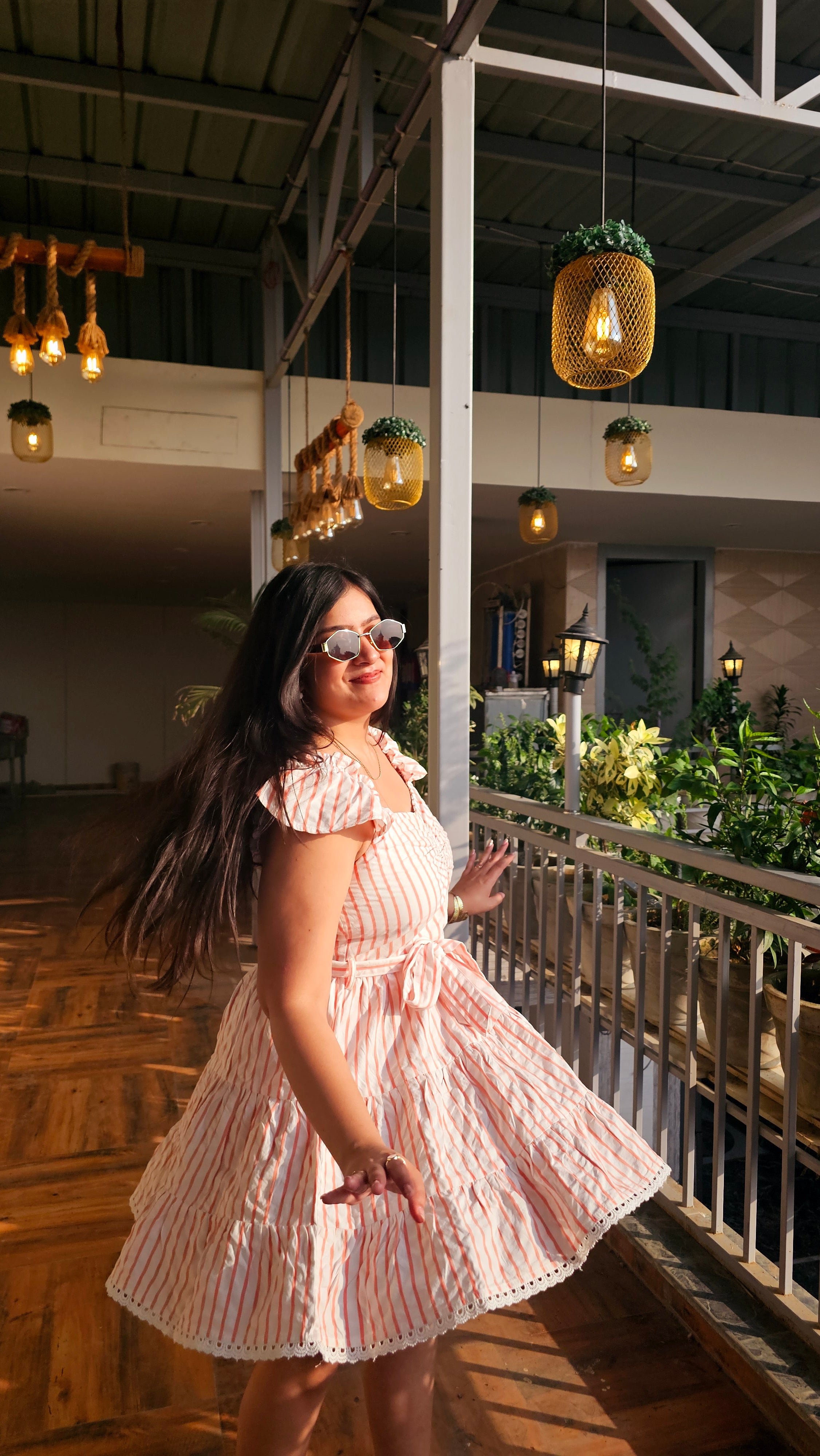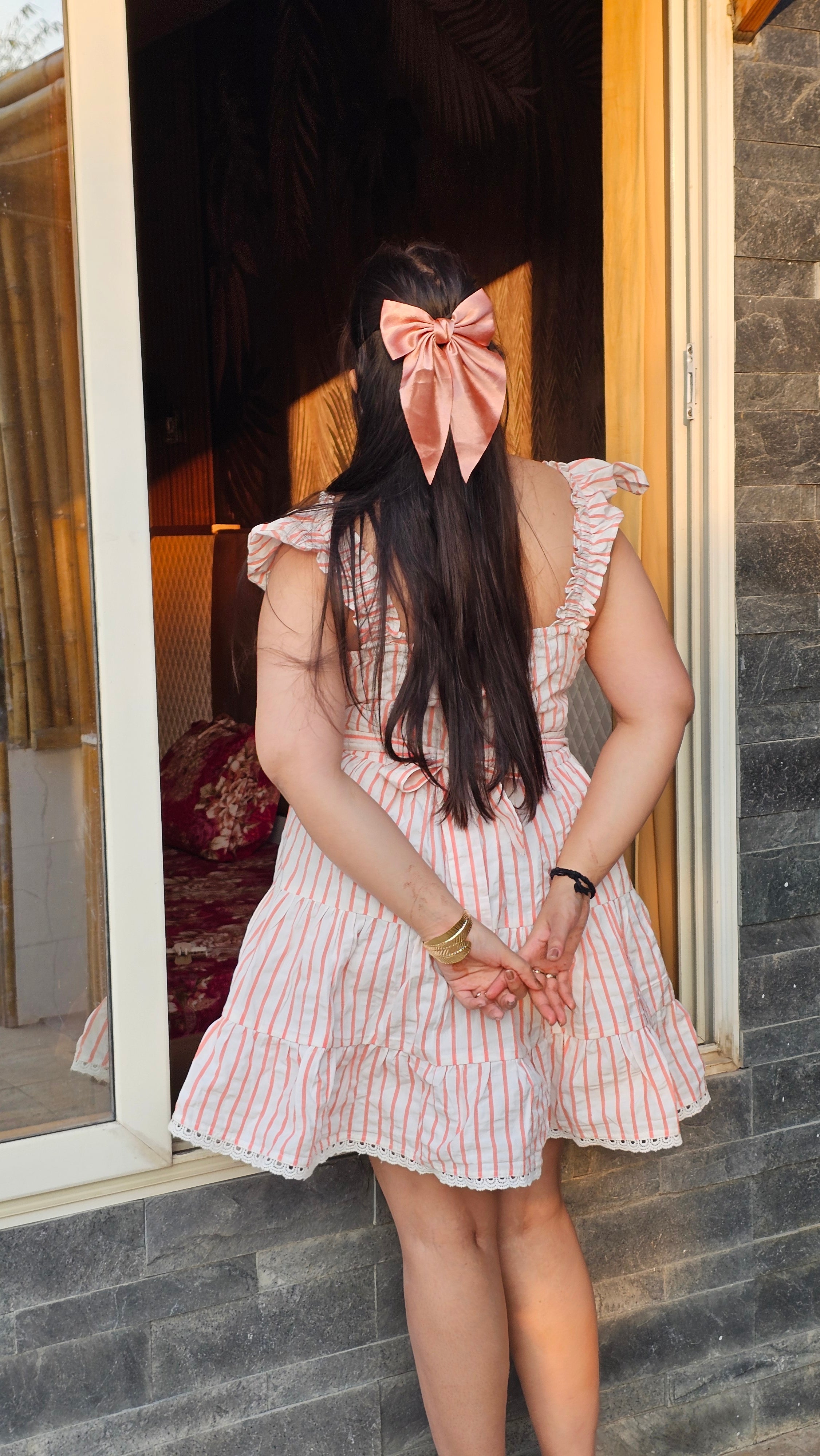 The Candy Stripe Dress is pure summer sweetness wrapped in style. Designed with ruffled sleeves, a gathered neckline, and a waist tie belt, it flatters your shape while keeping things breezy and cute. The peach stripes on an off-white base and the lace-edged hemline add that extra charm... making it your perfect pick for brunches, vacations, or sunny days