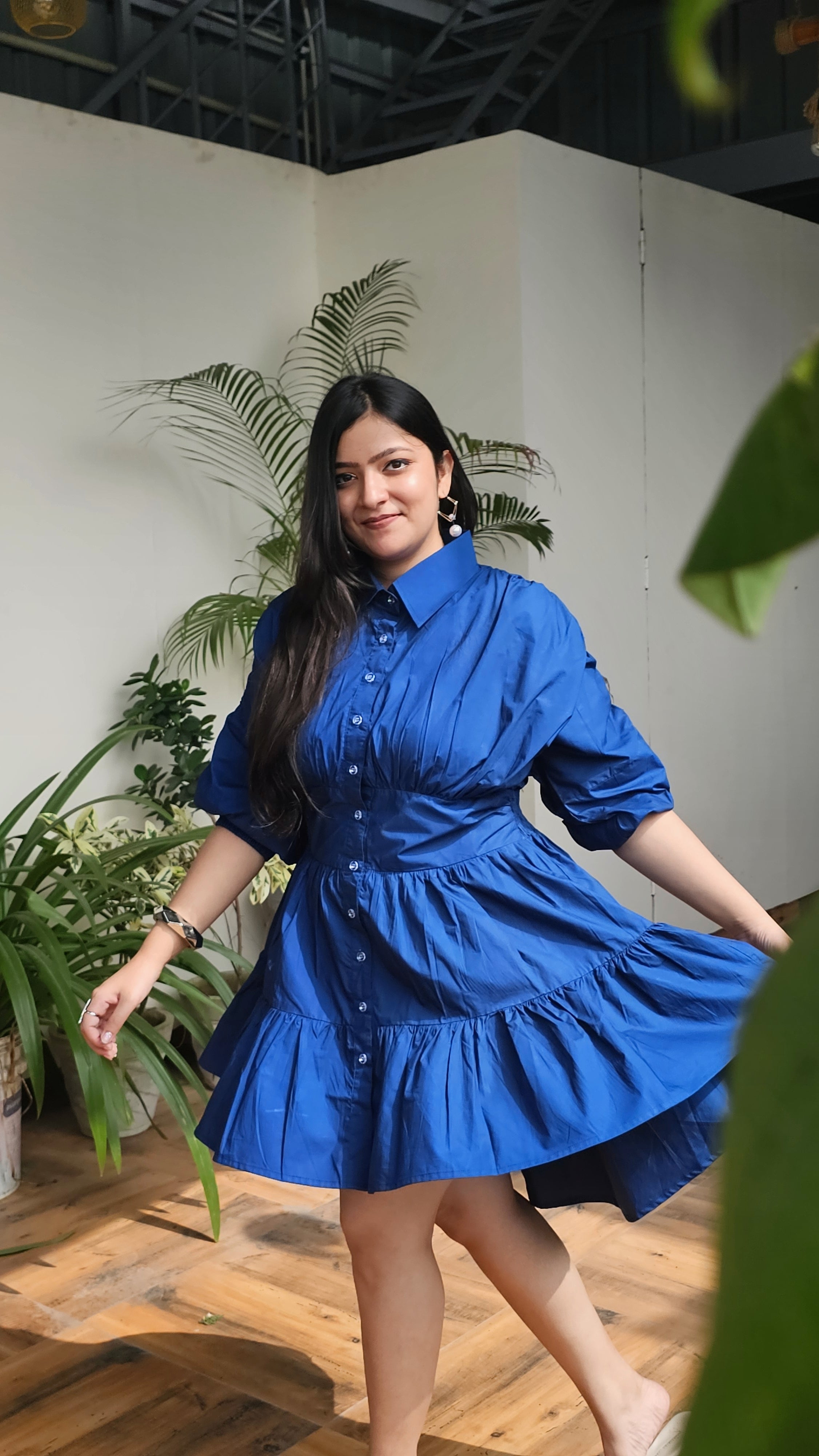 The Cobalt Crush Dress is all about bold color and timeless ease. Designed with a shirt-style front and ruched puff sleeves, it blends structure with soft volume. The smocked waist offers a flattering fit, while the tiered hemline adds a breezy finish. Made in vibrant cobalt blue, it’s perfect for brunches, outings, or when you want to make a confident style statement