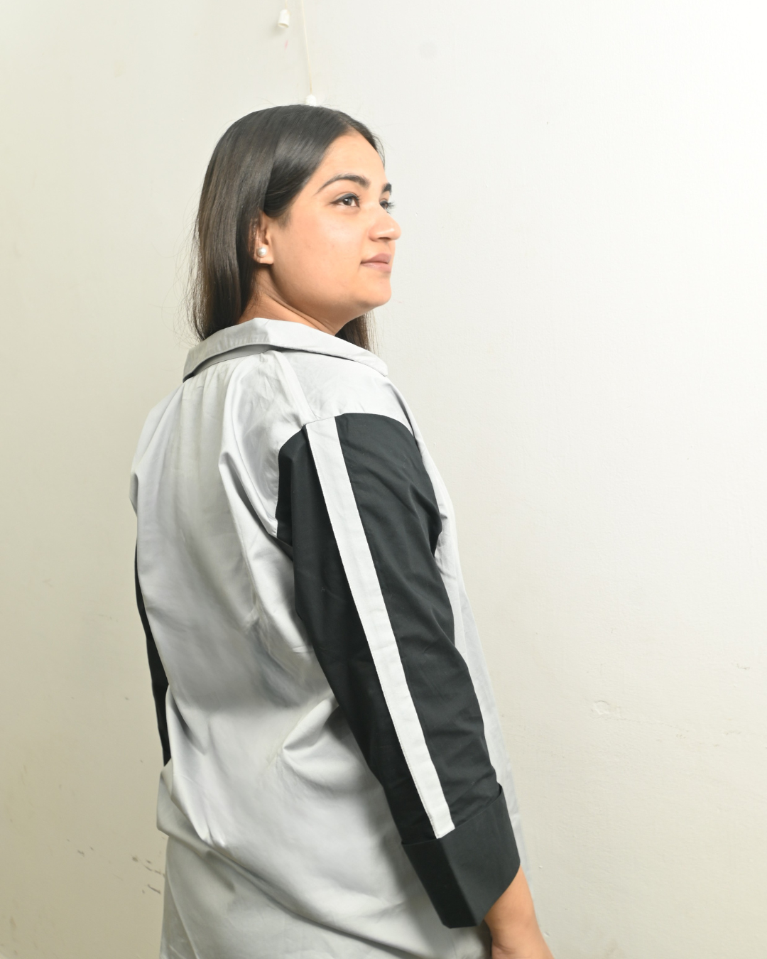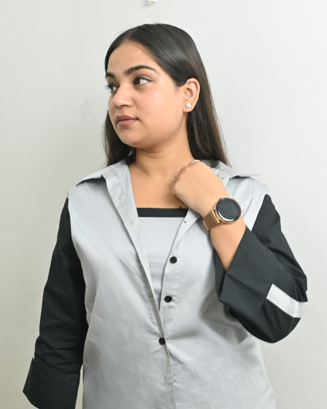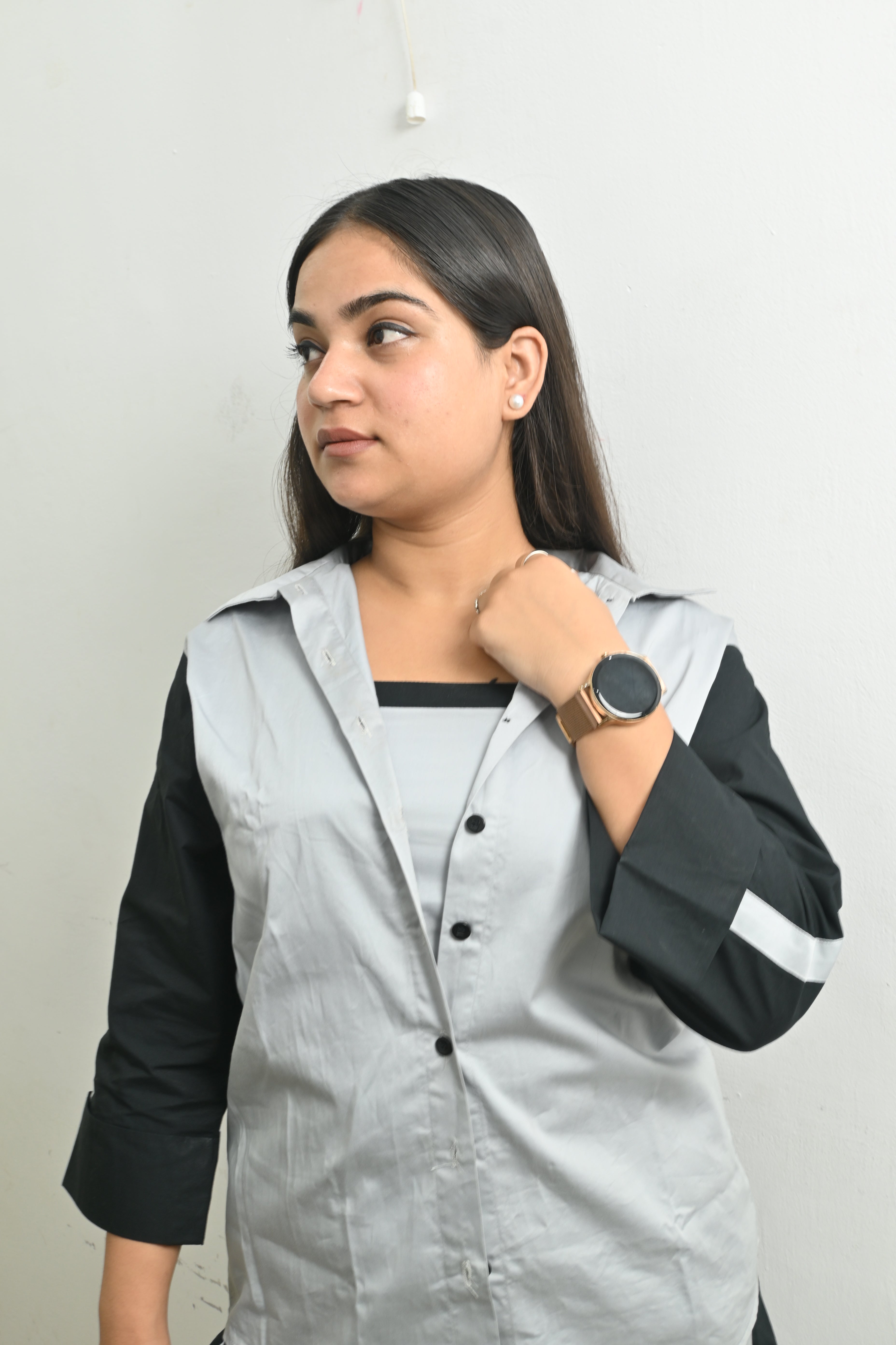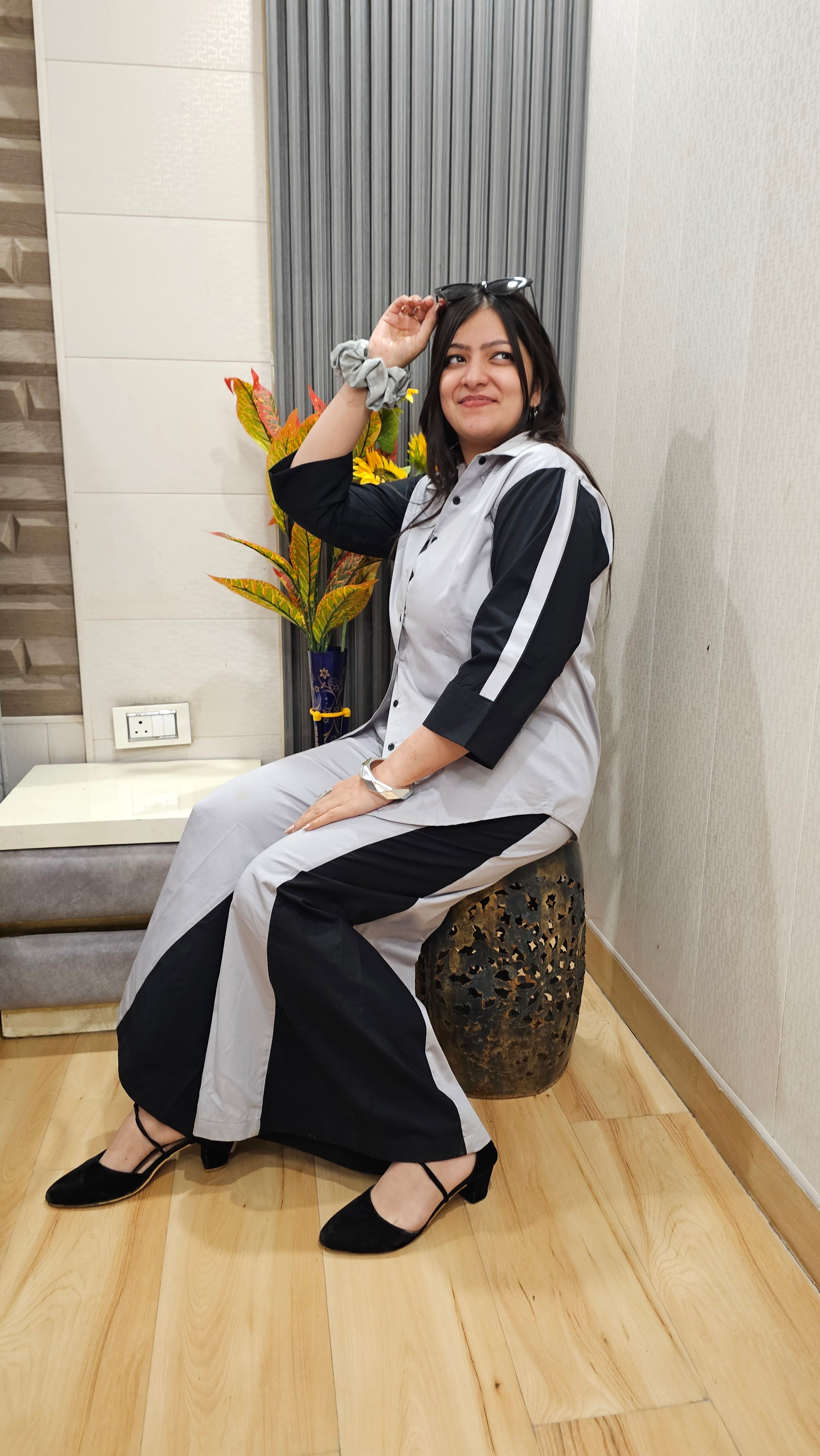 Elevate your everyday style with this chic 3-piece contrast co-ord set, crafted for girls who love comfort with a modern edge. Featuring a sleek black–grey button-down shirt, a matching crop inner, and wide-leg panel pants, this set gives you a stylishly elongated silhouette with effortless charm. Perfect for college, café outings, shopping days, or travel looks.