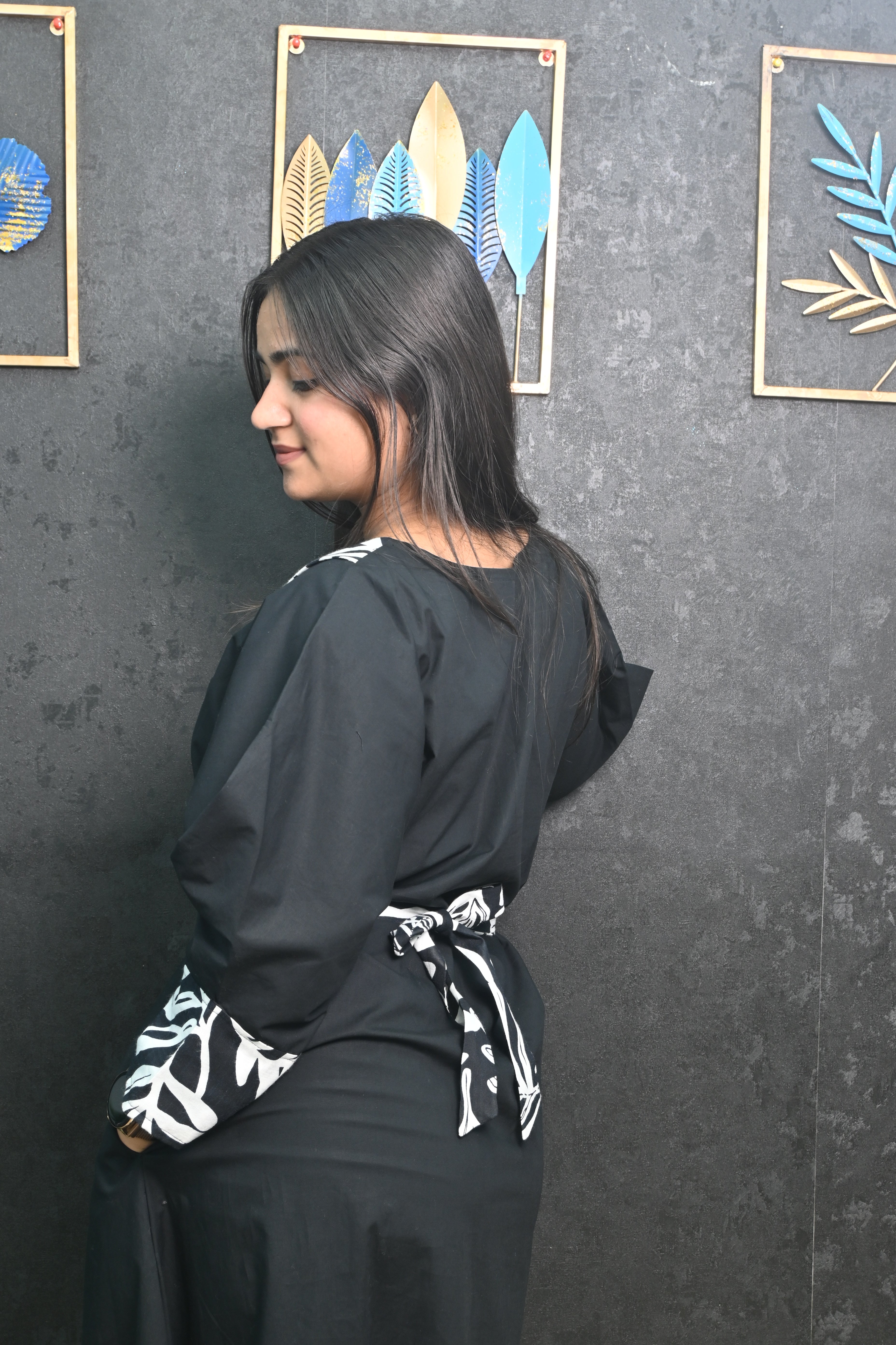 A statement piece designed in rich black fabric, the Leaf Noir Dress stands out with its striking printed collar, matching printed hem, and a coordinated print belt that ties the whole look together.